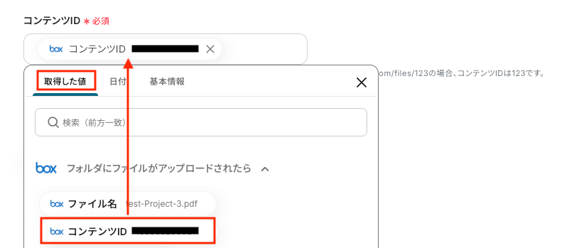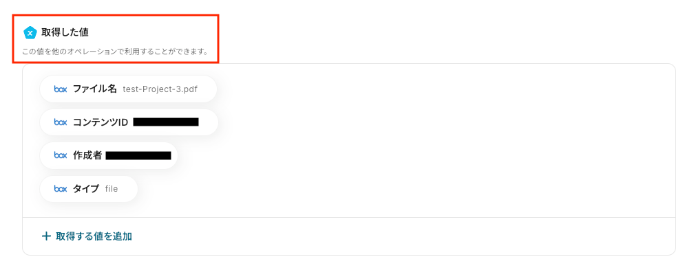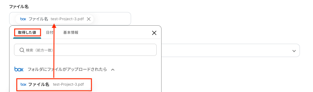 - Boxにファイルをアップロードするオペレーションでは、保存するファイル名や格納先のフォルダIDを任意で設定してください。