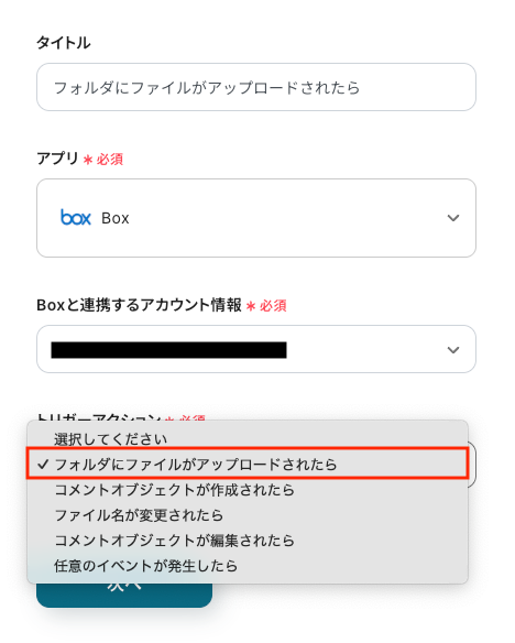 - 次に、トリガーでBoxを選択し、「フォルダにファイルがアップロードされたら」というアクションを設定します