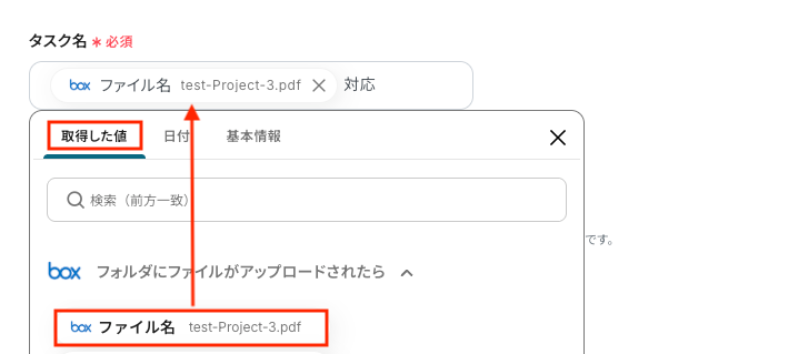 A:はい、可能です。有料プランでご利用いただける「分岐」を設定することで、特定のファイル名が付与されているものだけタスクを作ることができます。詳しくは「分岐」の設定方法をご覧ください。