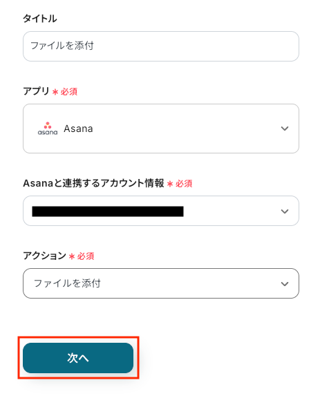 - 最後に、Asanaの「ファイルを添付する」アクションで、ダウンロードしたファイルを先ほど作成したタスクに添付します