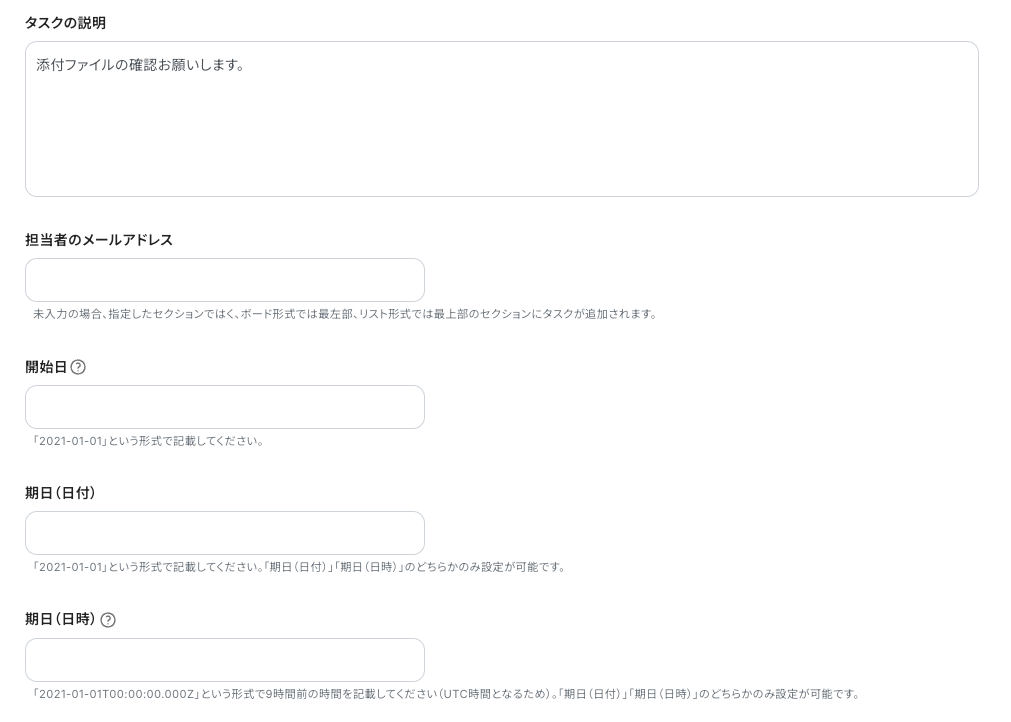 - タスクのタイトルや説明欄には、固定のテキストだけでなく、トリガーで取得したファイル名やAI機能で抽出した内容を変数として埋め込むなど、柔軟な設定が可能です