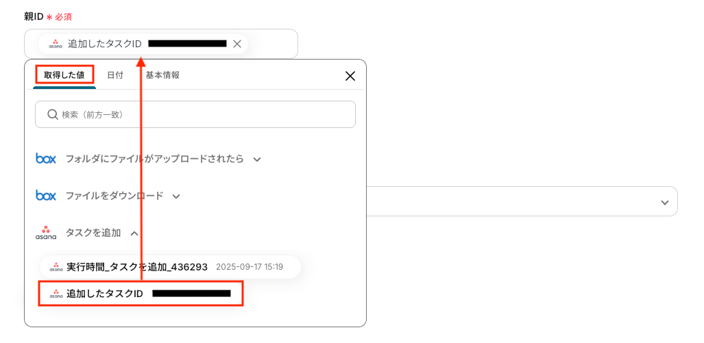 - 次に、Asanaの「タスクを追加する」アクションで、抽出した情報をもとにタスクを作成します