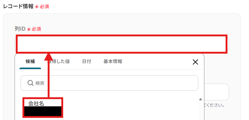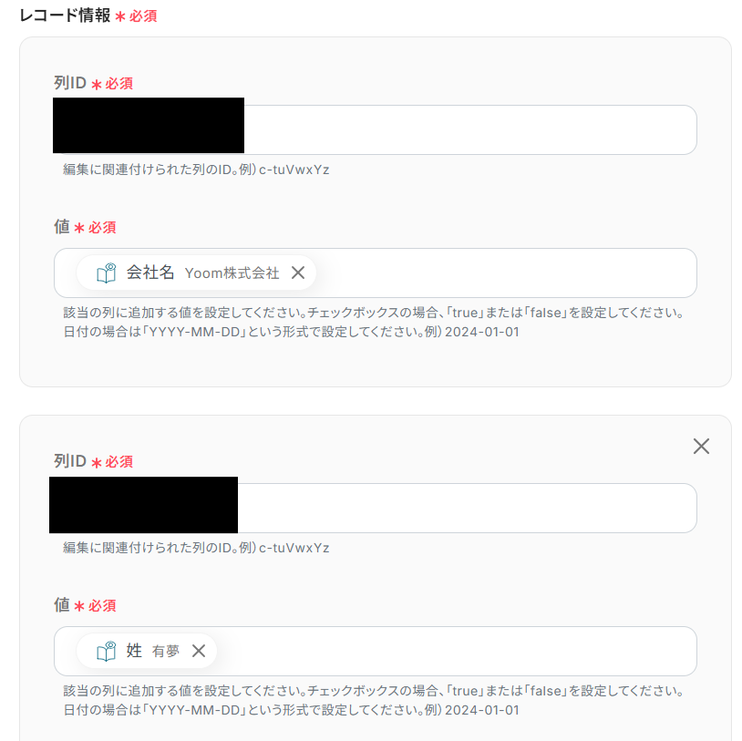 - Codaへの行追加のオペレーションでは、OCRで抽出したどの情報を、テーブルのどの列に追加するかを任意で設定してください