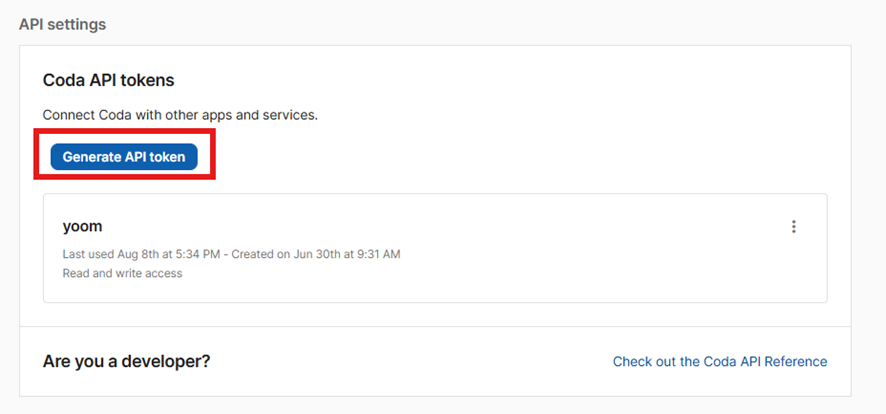 Codaの設定画面が表示されるので、下にスクロールして「API settings」の「Generate API token」を選択しましょう。