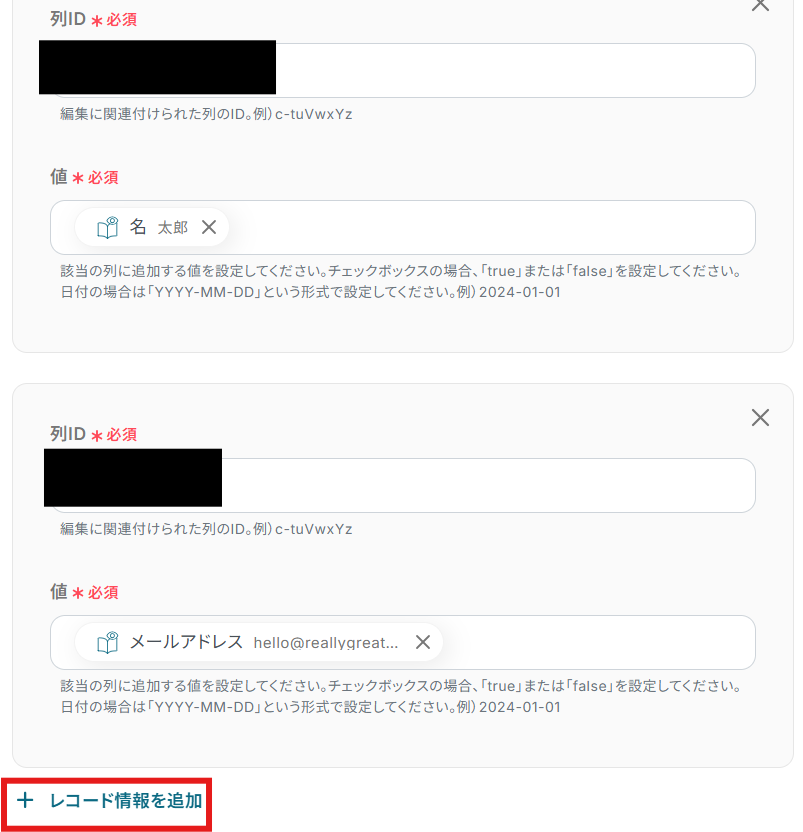 - Codaに行を追加する設定では、対象のドキュメントIDやテーブルIDを任意で指定し、追加する項目も固定値や前段で取得した値を埋め込むなど柔軟な設定が可能です。