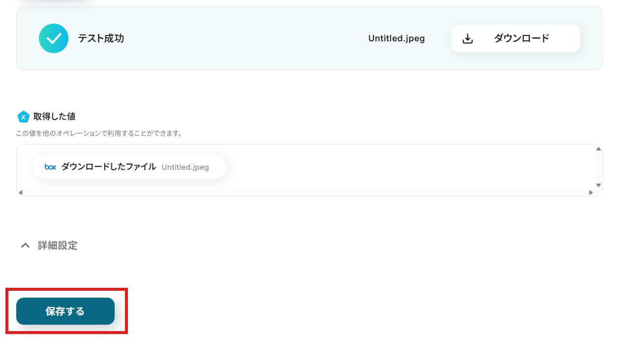 - 次に、オペレーションでBoxの「ファイルをダウンロード」アクションを設定し、条件に合致したファイルをダウンロードします。