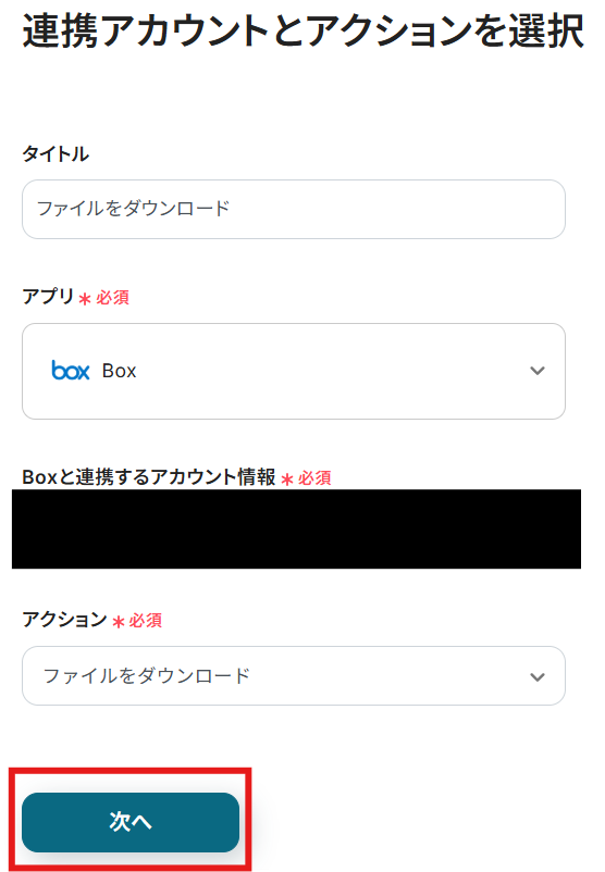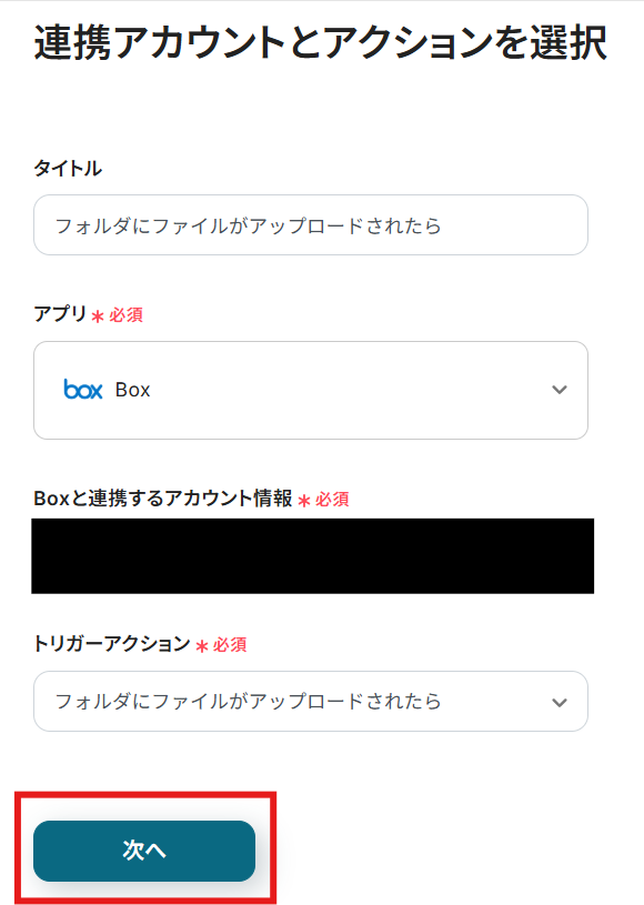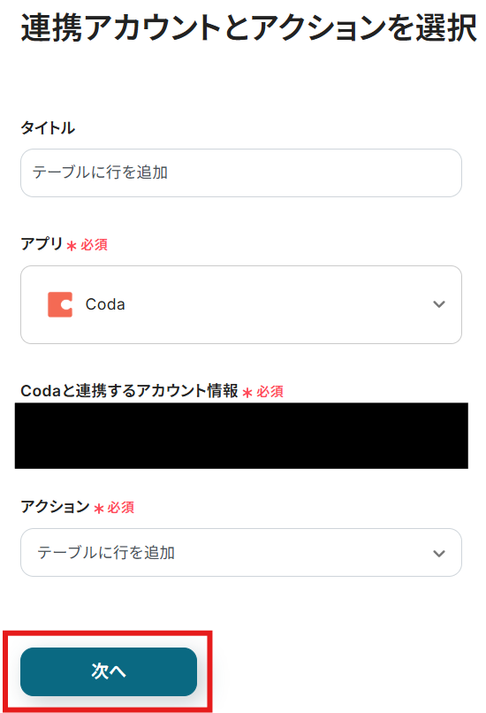 タイトルと連携するアカウント情報を確認し、アクションはテンプレート通りのまま「次へ」をクリックして進んでください。