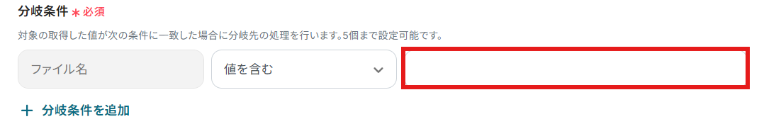 - 分岐機能の設定では、処理対象としたいファイルの条件(ファイル名に特定のキーワードを含む、特定のファイル形式など)を任意で指定してください。