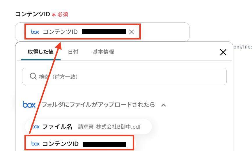 次に、「コンテンツID」を下図のようにアウトプットを使って設定します。