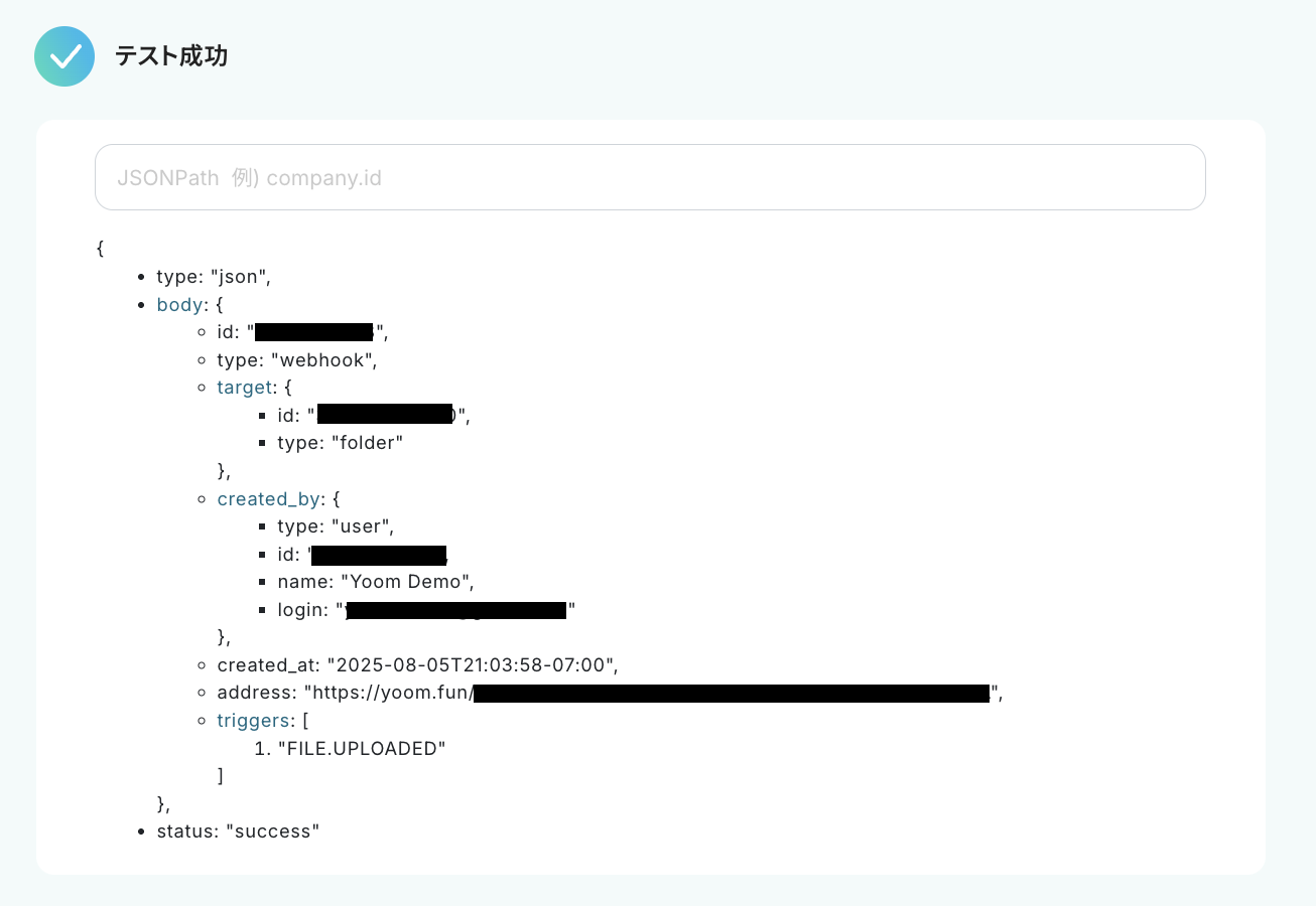 設定が完了したら、指定したBoxのフォルダとYoomの連携チェックを行います。