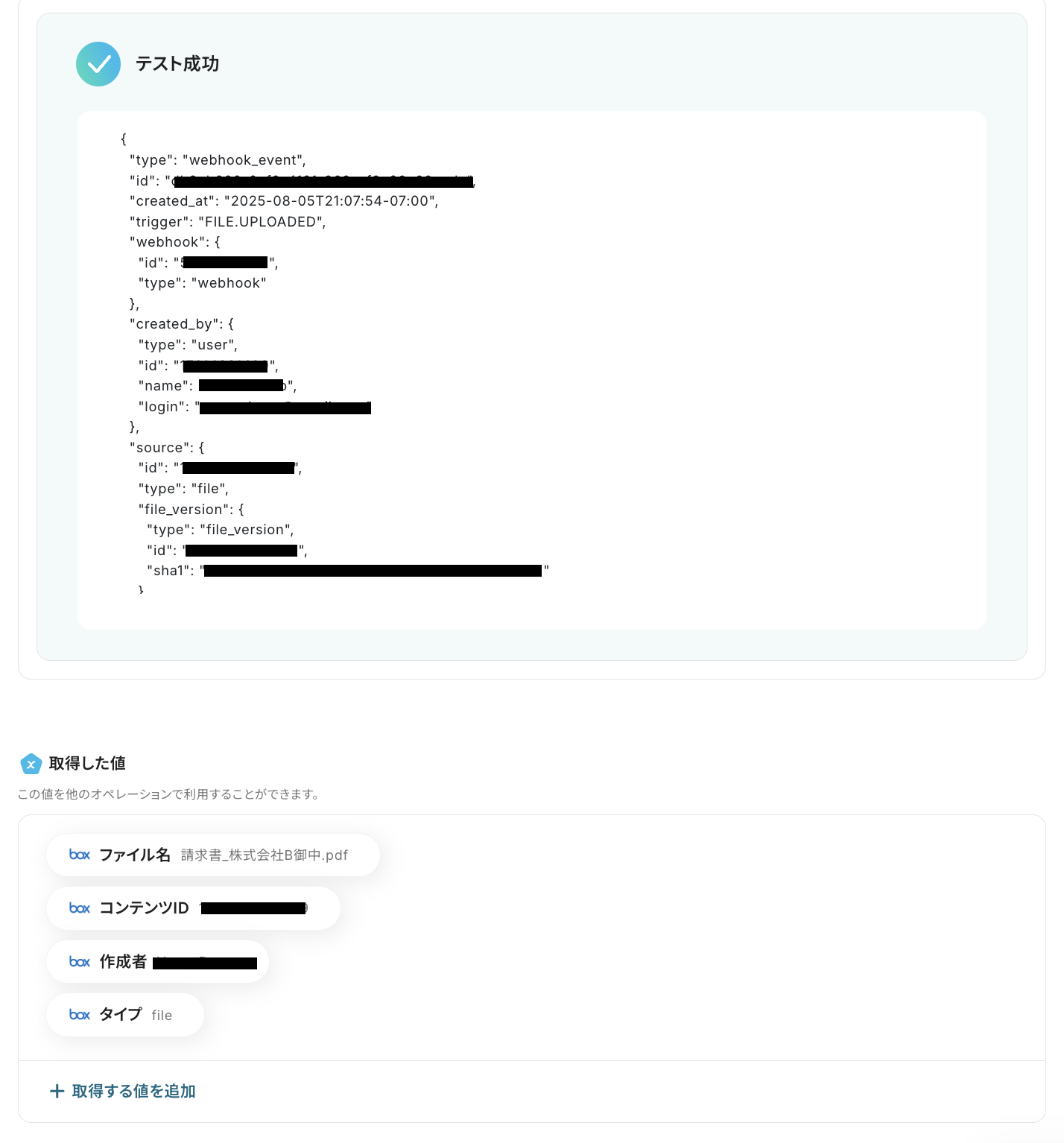 テストが成功すると、先ほどアップロードしたファイルの情報が「取得した値」にアウトプットとして抽出されるので、内容を確認しましょう。