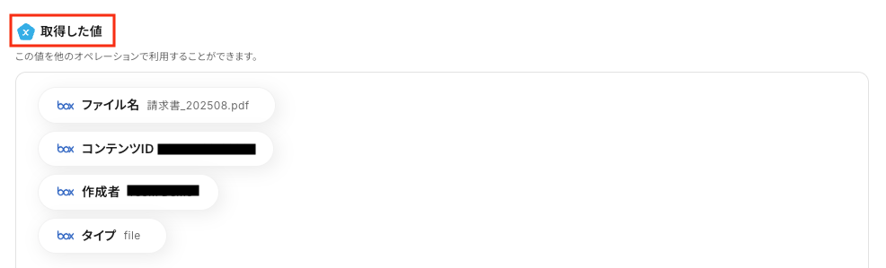 ※「取得した値(=アウトプット)」は、後のフローで使用可能です。
