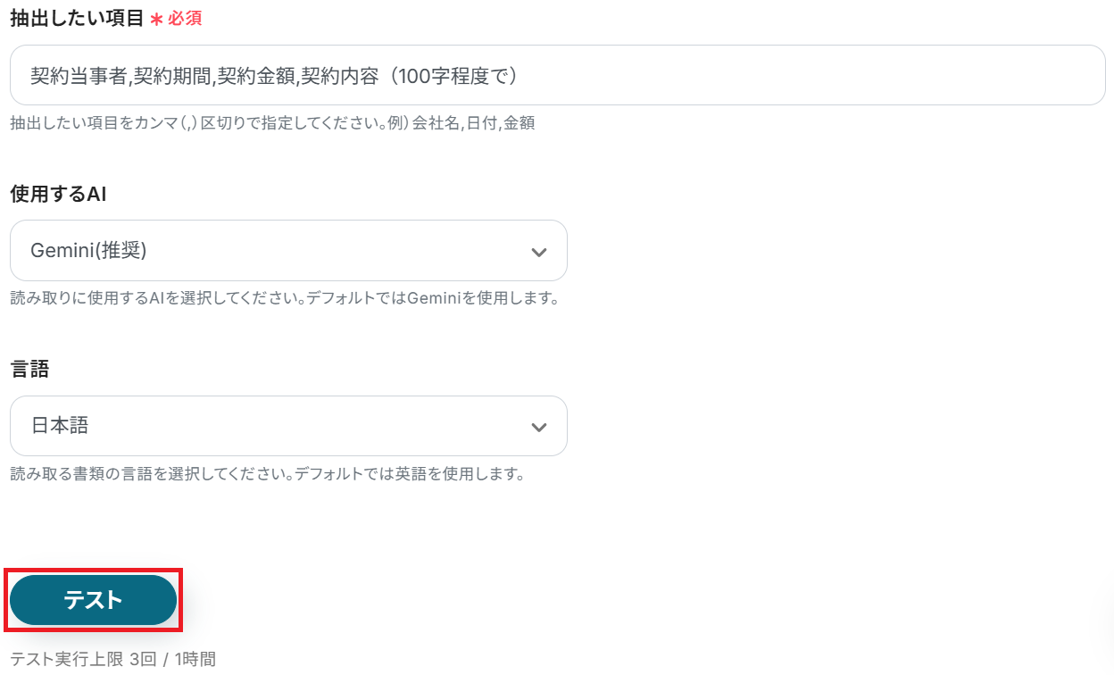 「抽出したい項目」も予め設定されていますが、編集・追加する場合はカンマ区切りで入力してください。