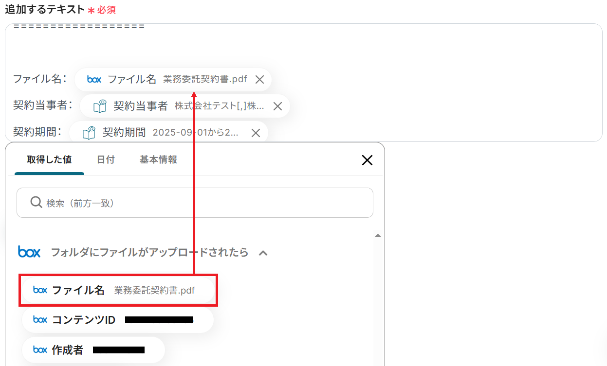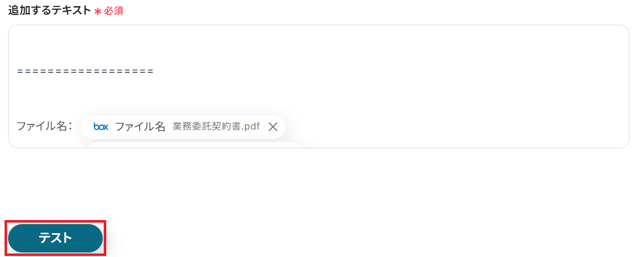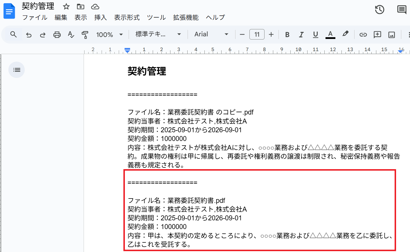 例として「契約管理」というドキュメントの文末に抽出したテキストを追加します。