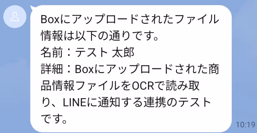 Boxの指定フォルダに商品情報などが記載されたファイルがアップロードされると、そのファイル内容をOCR(光学的文字認識)機能で自動的にテキスト化し、必要な情報を抽出してLINE公式アカウントから関係者へ素早く通知します。