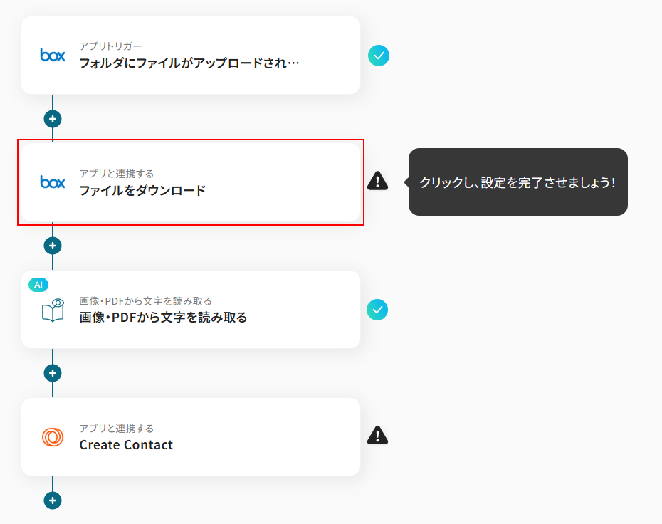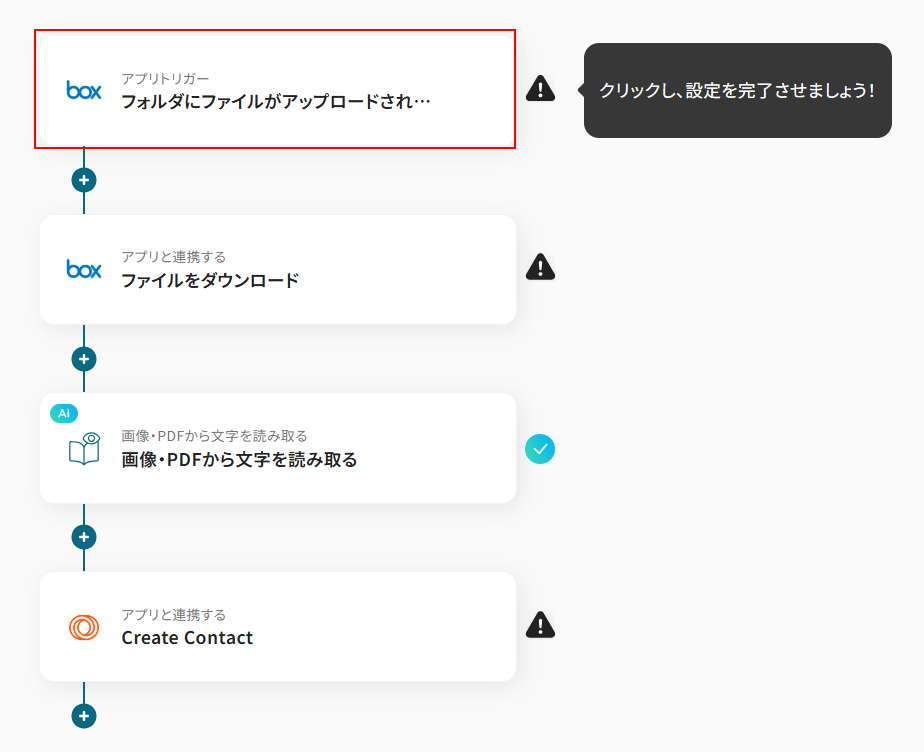 今回はBoxにファイルがアップロードされたら、OCRを行いLoopsにContactを作成するフローを作成していきます! 作成の流れは大きく分けて以下です。
