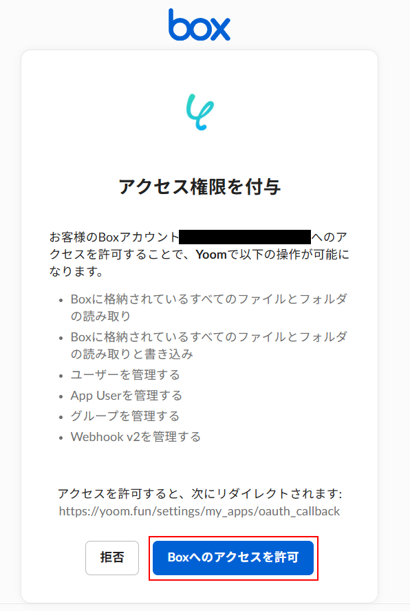 表示内容を確認し問題なければ「Boxへのアクセスを許可」をクリックします。