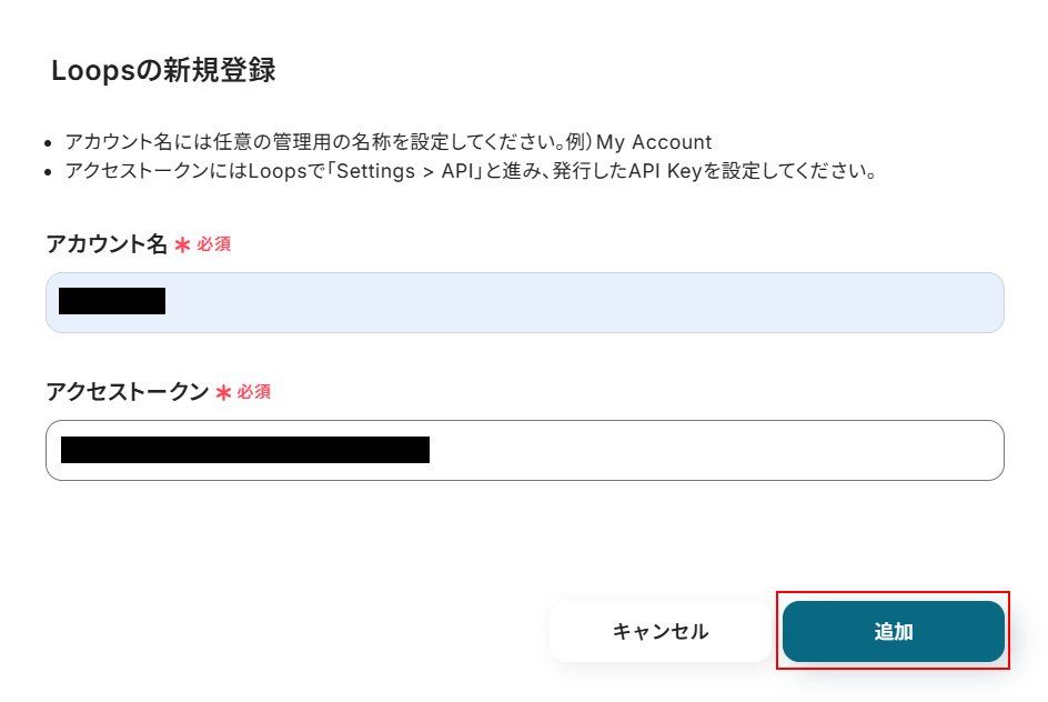 マイアプリ画面で「+新規接続」ボタンをクリックし、入力欄に「Loops」と入力します。 アプリが表示されますのでクリックしましょう。 以下の画面が表示されたら表示内容を確認し、アカウント名、アクセストークンをそれぞれ入力し「追加」をクリックします。