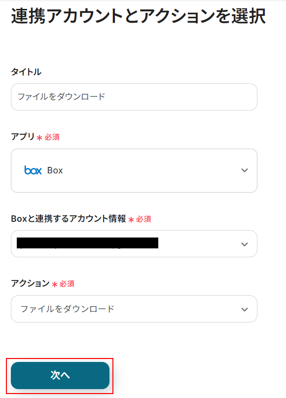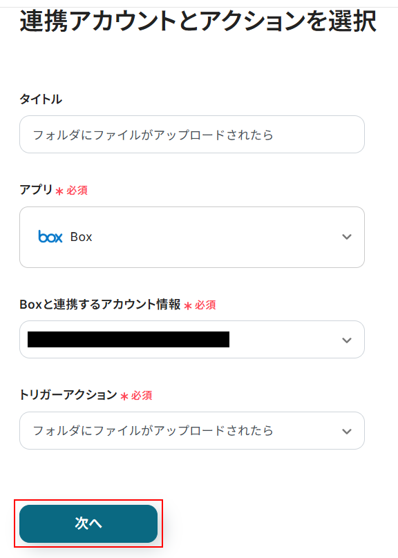 タイトルは任意のものに変更可能です。 変更がない場合はそのままでも問題ありません。 Boxと連携するアカウント情報には、先ほどステップ1で連携したアカウントが表示されています。 アカウントを確認し問題なければ「次へ」をクリックしてください。