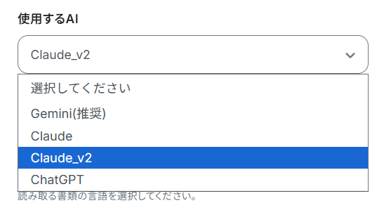 使用するAIを選択します。 今回はClaude_v2を使用しますが、プルダウンメニューから変更することも可能です。 AIモデルの違いについて知りたい方は以下のリンク先をご覧ください。