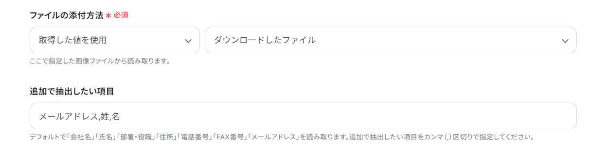 ファイルの添付方法を設定します。 デフォルトで「取得した値を使用」「ダウンロードしたファイル」が設定されています。 この設定を行うことで、先ほどのステップ4でダウンロードしたファイルを読み取りの対象とすることができるのです。 今回はそのまま使用しますが、プルダウンメニューから変更することも可能です。