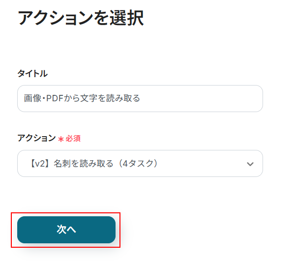 タイトルは任意のものに変更可能ですが、変更がなければそのままでも問題ありません。 アクションはデフォルトで設定されている【v2】名刺を読み取る(4タスク)をそのまま使用します。 「次へ」をクリックしてください。