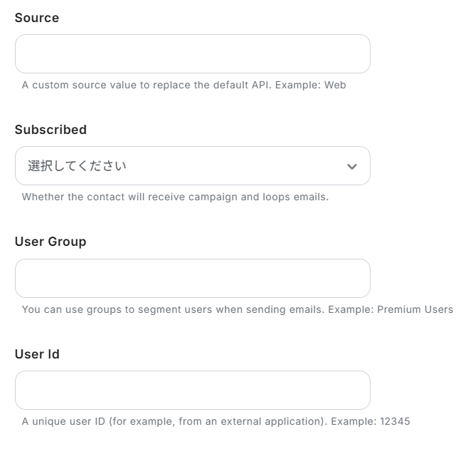 Source、Subscribed、User Group、User IDを設定します。 それぞれ設定が必要な場合は取得した値、もしくは直接入力で設定してください。 使用しない場合は空欄または「選択してください」のままでも問題ありません。