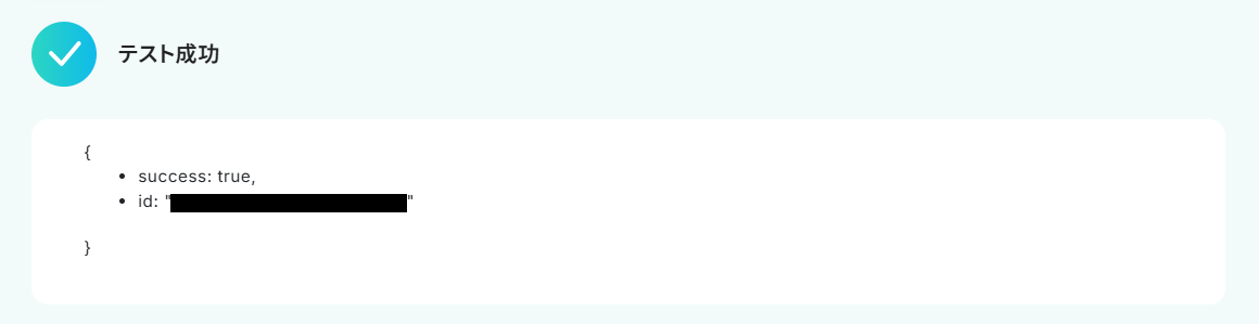 テストに成功するとテスト成功画面が表示され、以下のように取得した値(アウトプット)が表示されます。 取得した値はこのあとの設定でも使用します。 詳しく知りたい方は以下のリンク先をご覧ください。