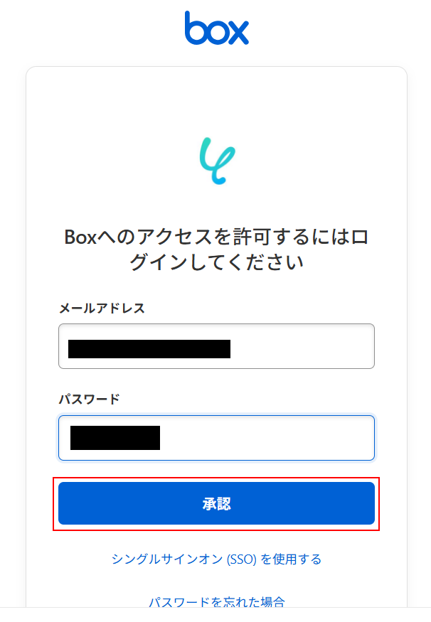 以下の画面が表示されたら、Boxに登録しているメールアドレスとパスワードを入力し「承認」をクリックしてください。
