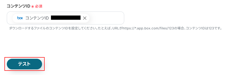 フォルダのコンテンツIDを設定します。 注釈を確認しながら、先ほどコピーしたURLからコンテンツIDとなる部分を抜き出して入力してください。 入力できたら「テスト」をクリックします。