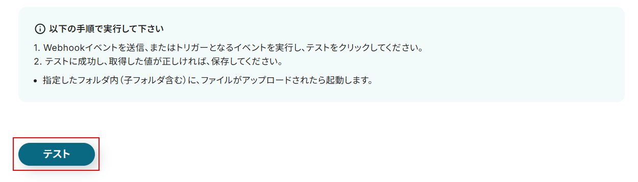 ファイルがアップロードできたら、Yoomの画面に戻り「テスト」をクリックしましょう。
