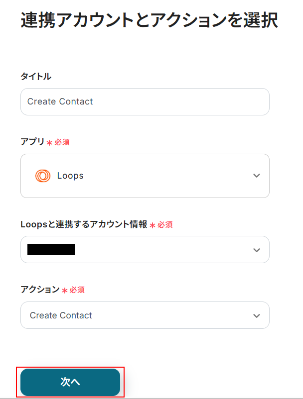 タイトルは任意のモノに変更可能ですが、変更がない場合はそのままでも問題ありません。 Loopsと連携するアカウント情報には、ステップ1で連携したアカウントが設定されています。 アカウントを確認し問題なければ「次へ」をクリックしてください。