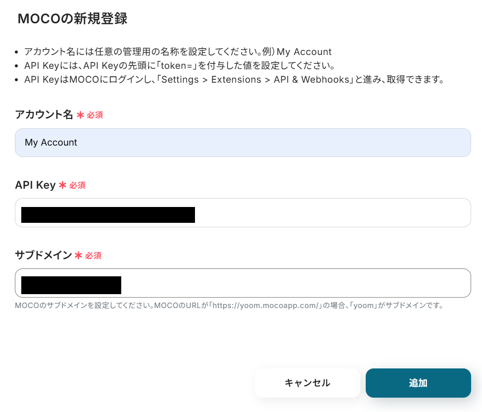 注釈に従ってアカウント名、API Key、サブドメインを入力し「追加」をクリックしましょう。
