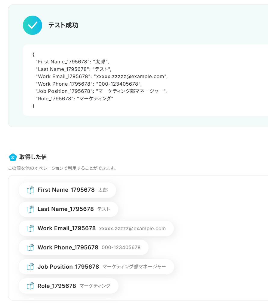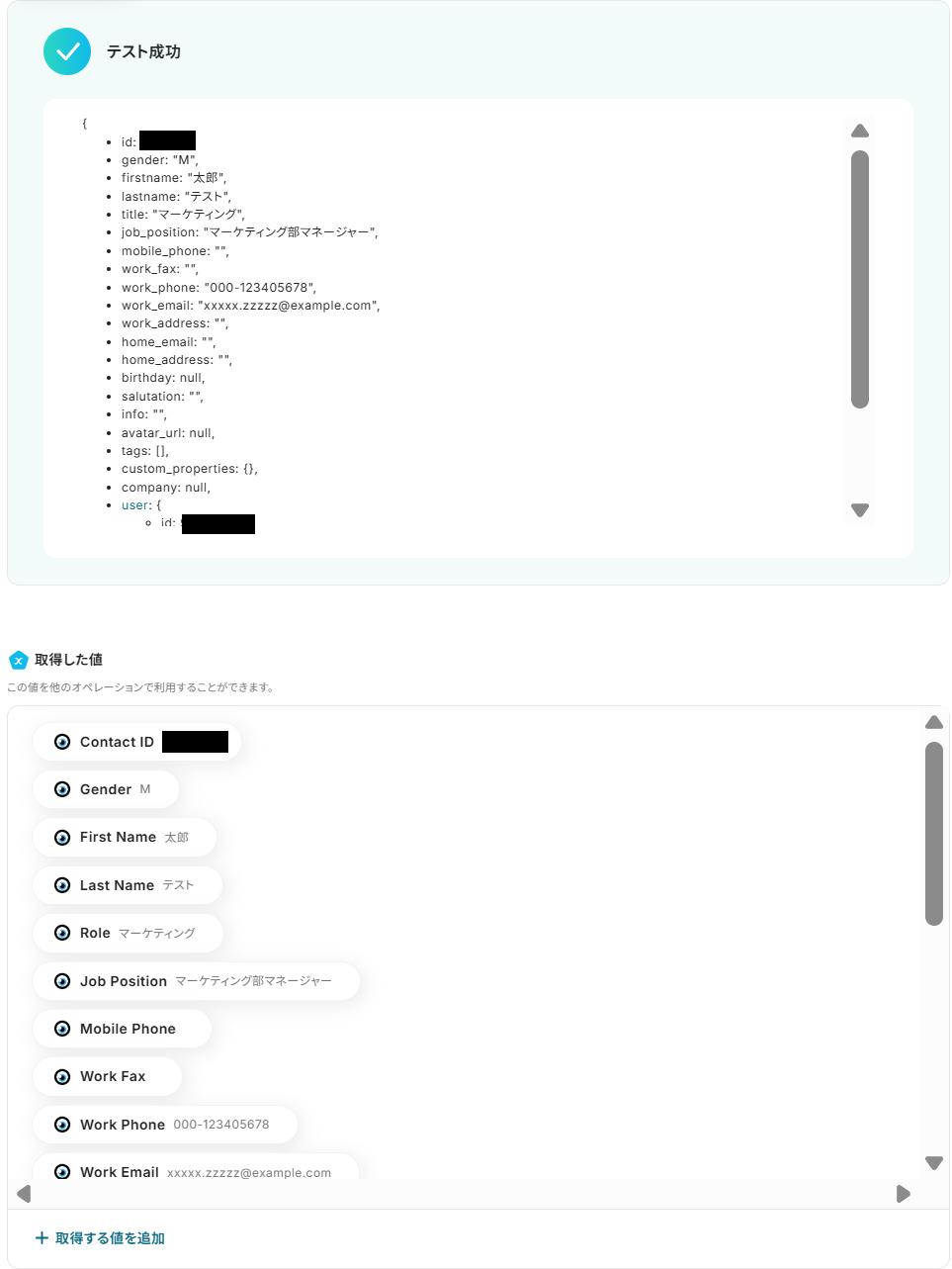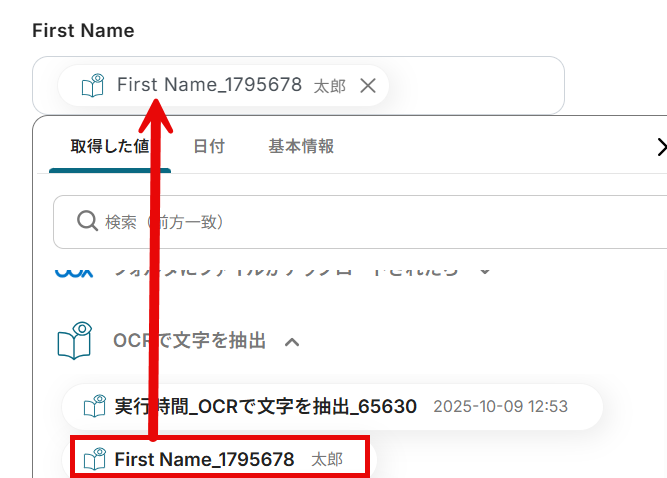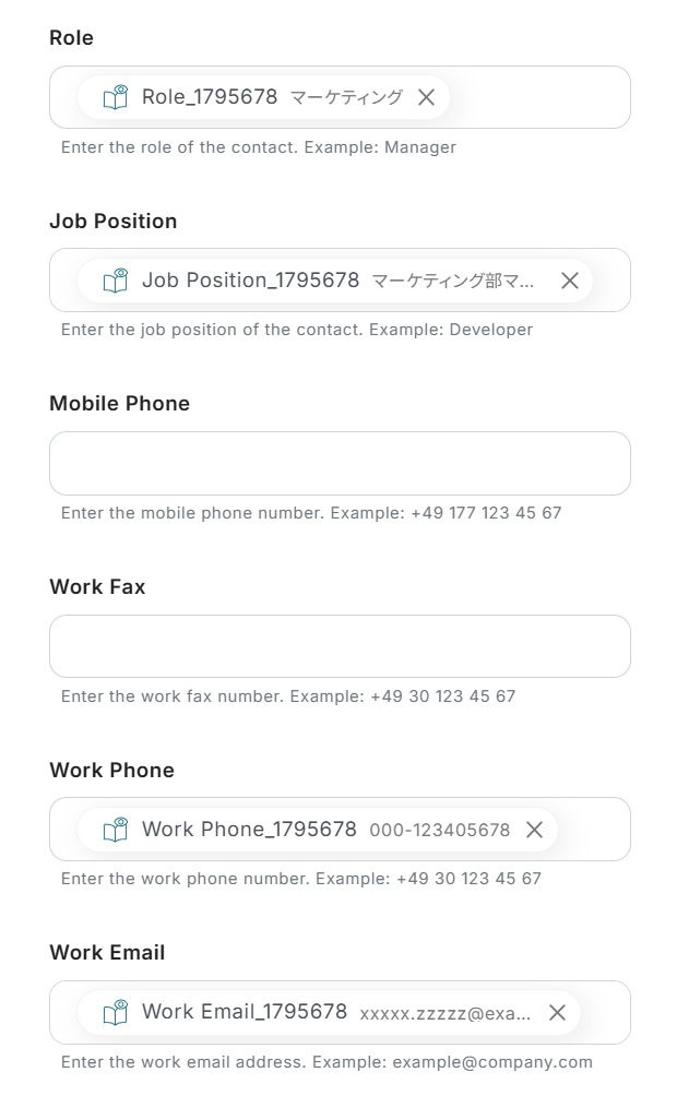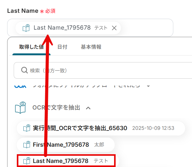 - MOCOへContactを作成するアクションでは、前段のOCR機能で取得した値を引用し、どのフィールドに登録するかを自由に設定できます