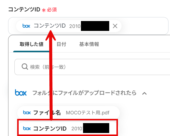 - Boxにファイルをアップロードするオペレーションでは、保存するファイル名や格納先のフォルダIDを任意で設定してください。