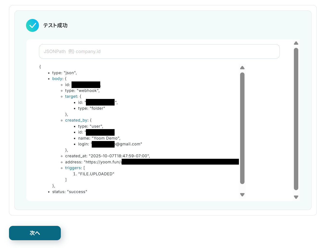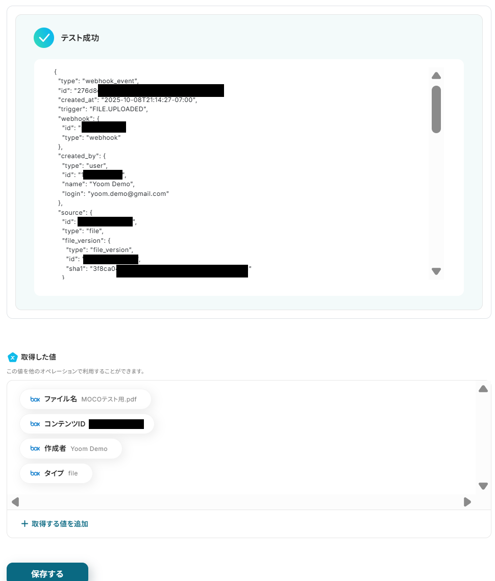 この画面で、「テスト」をクリックする前に、Webhookイベント(Boxにファイルをアップロード)を実行します。
