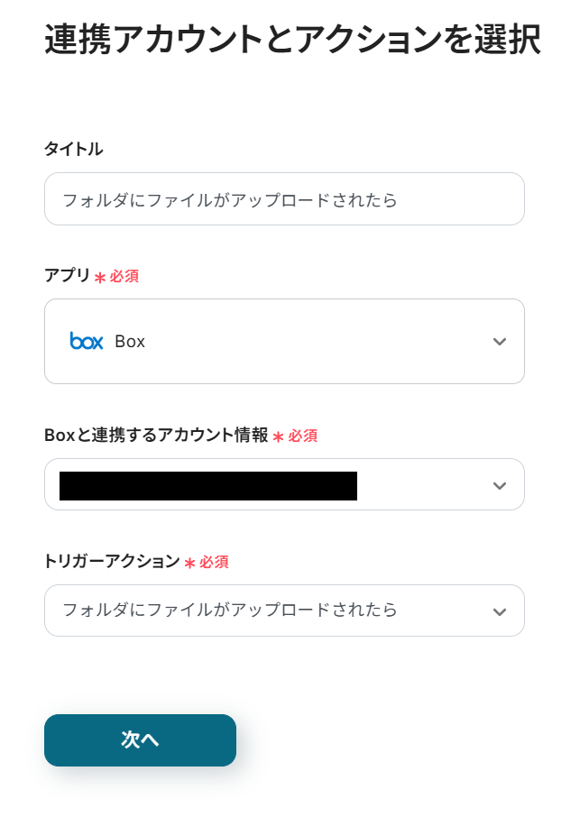 - トリガーアクション:Boxのフォルダにファイルがアップロードされたら起動します。