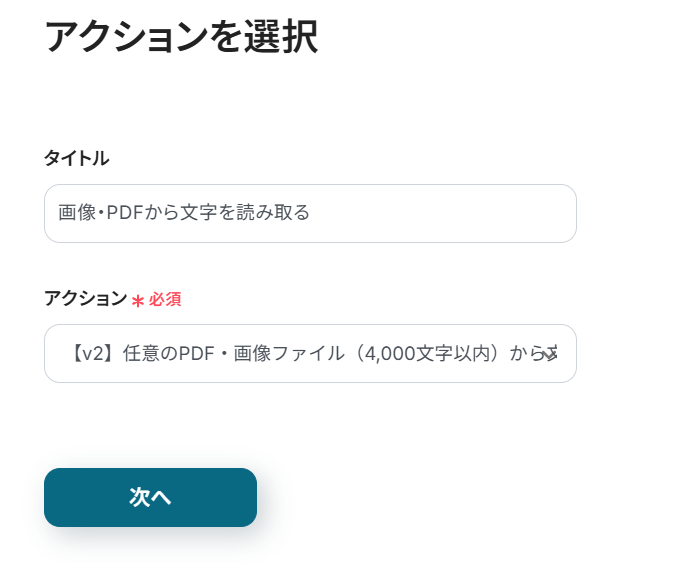 - 次に、オペレーションでOCR機能の「任意の画像やPDFを読み取る」を設定し、ファイルからテキスト情報を抽出します