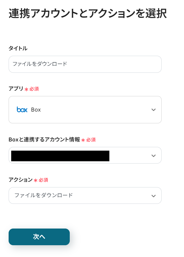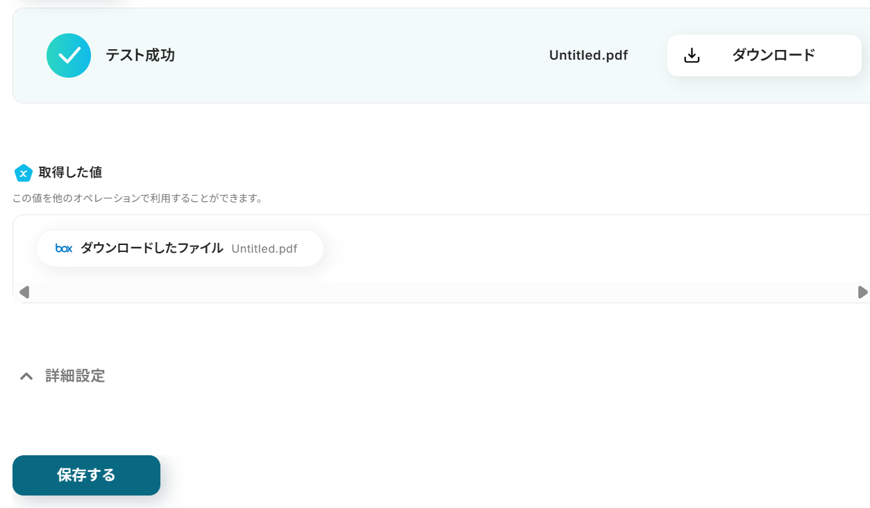 - 続いて、オペレーションでBoxの「ファイルをダウンロード」アクションを設定し、アップロードされたファイルをYoom内に取得します