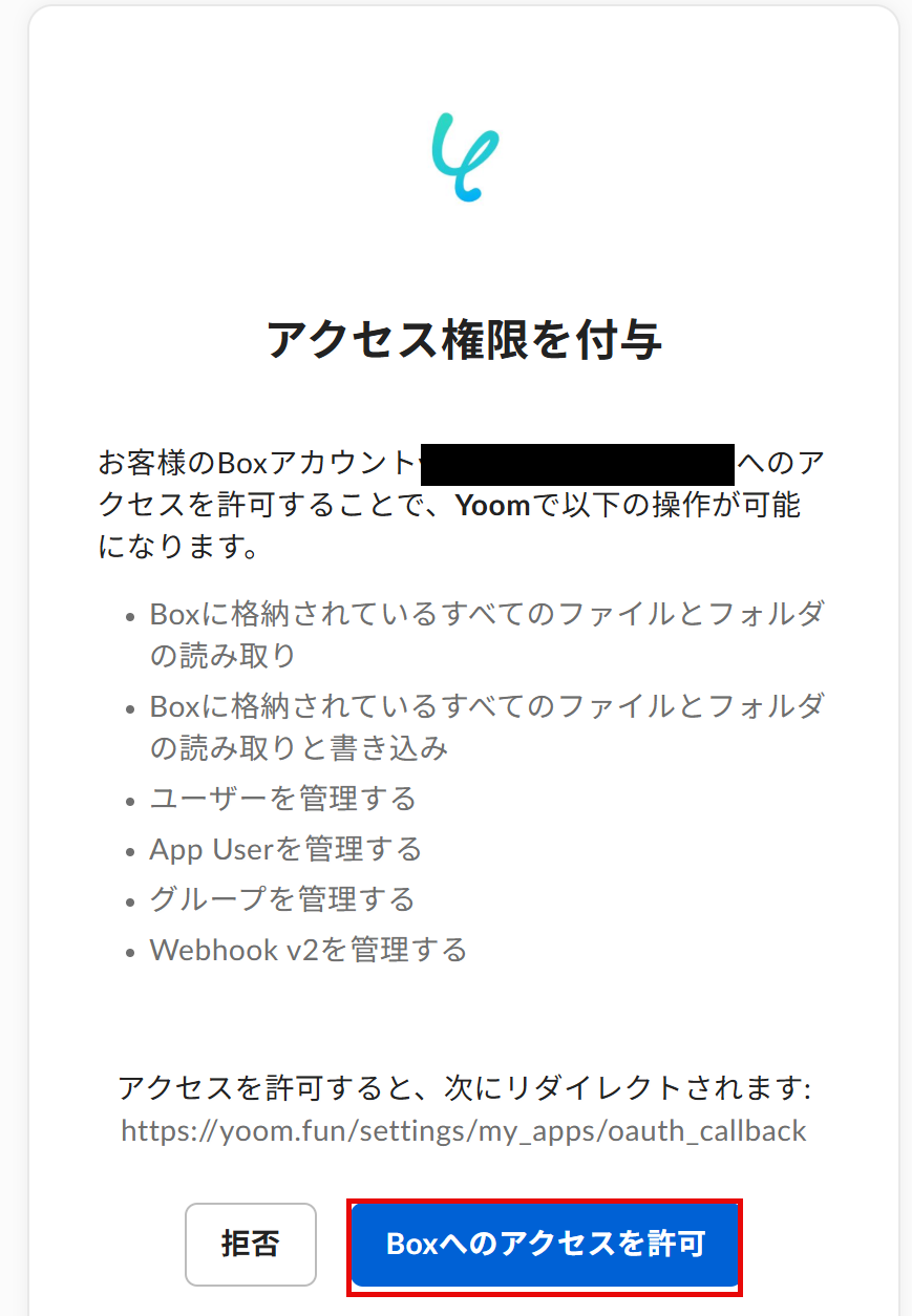 以下の画面から、「Boxへのアクセスを許可」をクリックします。