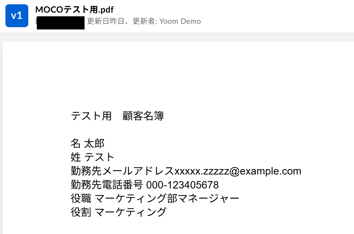 Boxの指定フォルダに名刺や請求書などのPDFファイルがアップロードされた際に、そのファイル情報をOCR機能で自動的にテキスト化し、MOCOに新しい顧客(Contact)情報として登録する連携です。