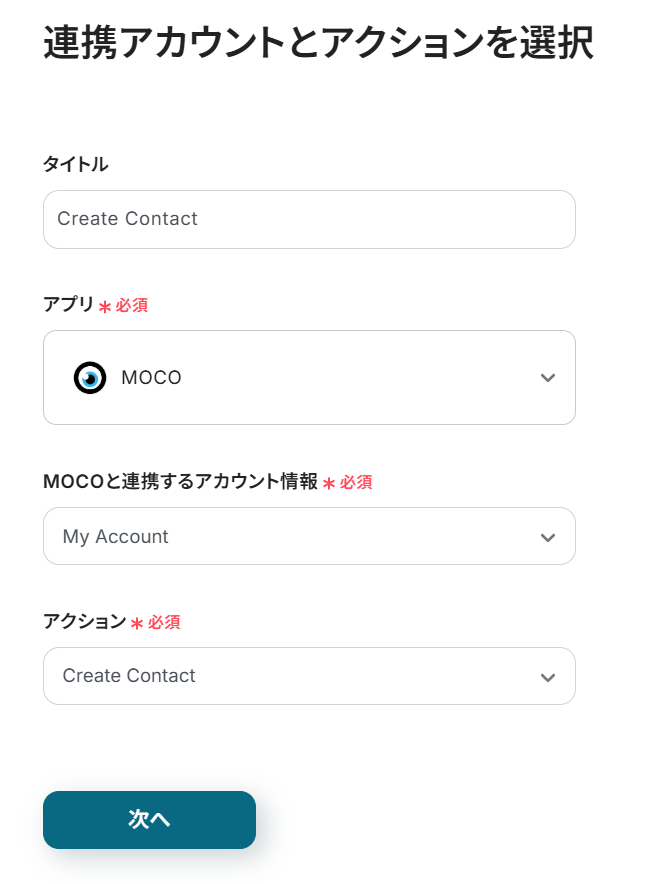 - 次に、トリガーでMOCOを選択し、「新しいContactが作成されたら」というアクションを設定します