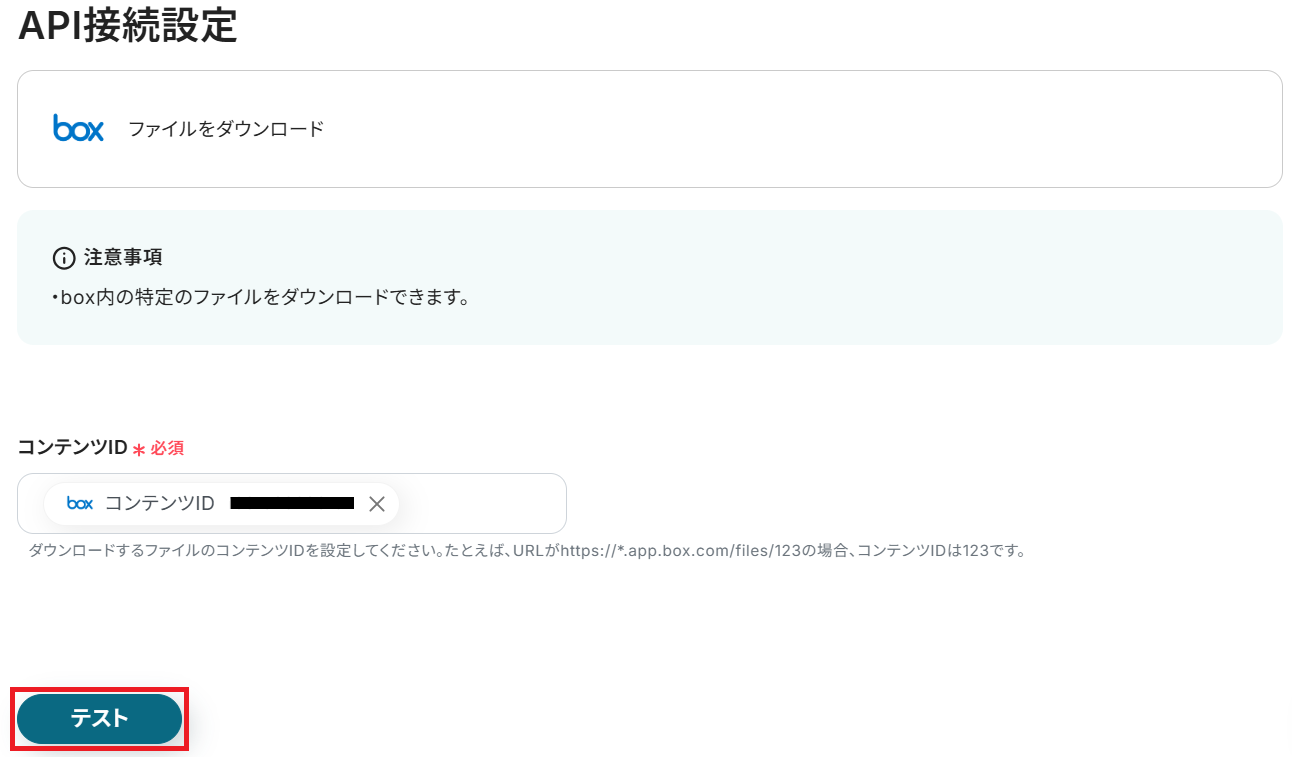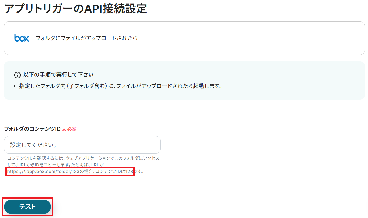 テキストボックス下部の説明を参考に、フォルダのコンテンツIDを入力してテストしてください。