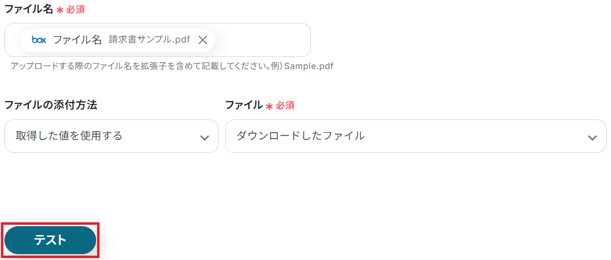 ファイル名・ファイルの添付方法・ファイルは予め設定されている通りで大丈夫なので、そのままテストしてください。