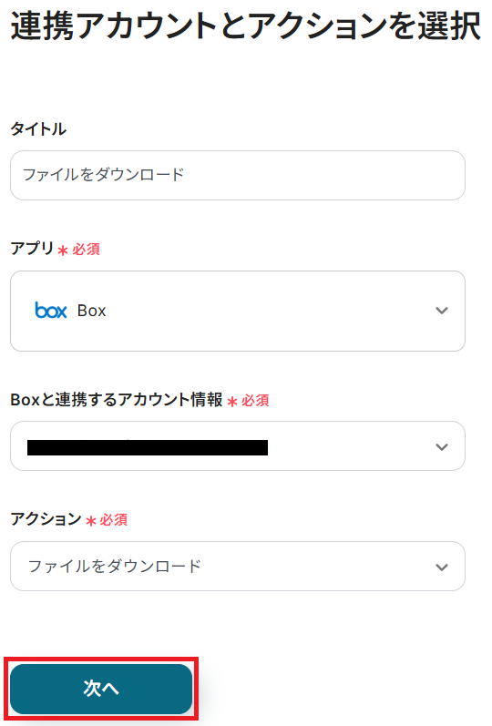 ステップ3と同様、アクションは「ファイルをダウンロード」のまま「次へ」をクリックします。
