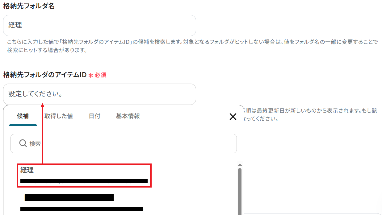 格納先フォルダ名の欄に該当のキーワード(今回でいうと「経理」)を入力すると、フォルダIDの候補が絞られます。