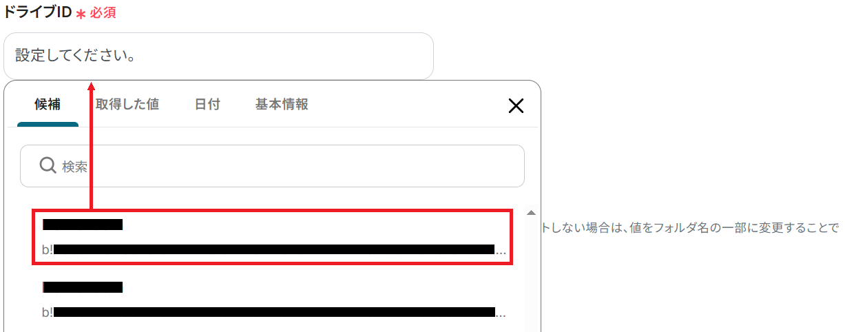 同様に、格納先フォルダのアイテムIDも選択しましょう。