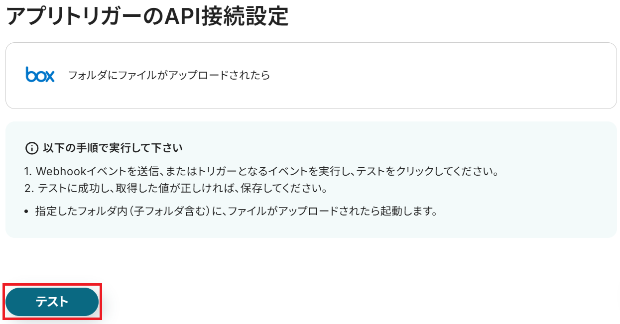 すでに既存のフローボット等でAPI疎通(テスト含む)を行い、WebhookIDが付与されている場合、別のフローボットではそのフォルダのWebhookによるイベント検知ができない仕様になっているので、新規フォルダを作成してファイルをアップロードすることをお勧めします。