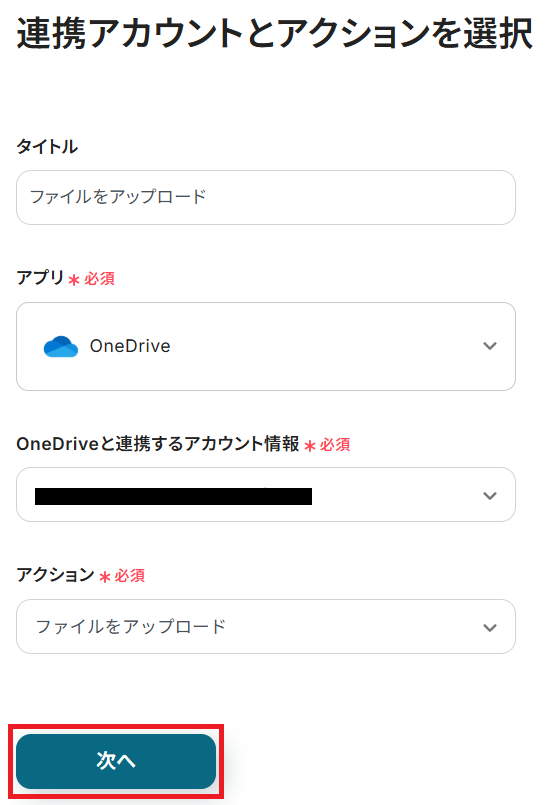 ステップ3・4と同様、アクションは「ファイルをアップロード」のまま「次へ」をクリックします。
