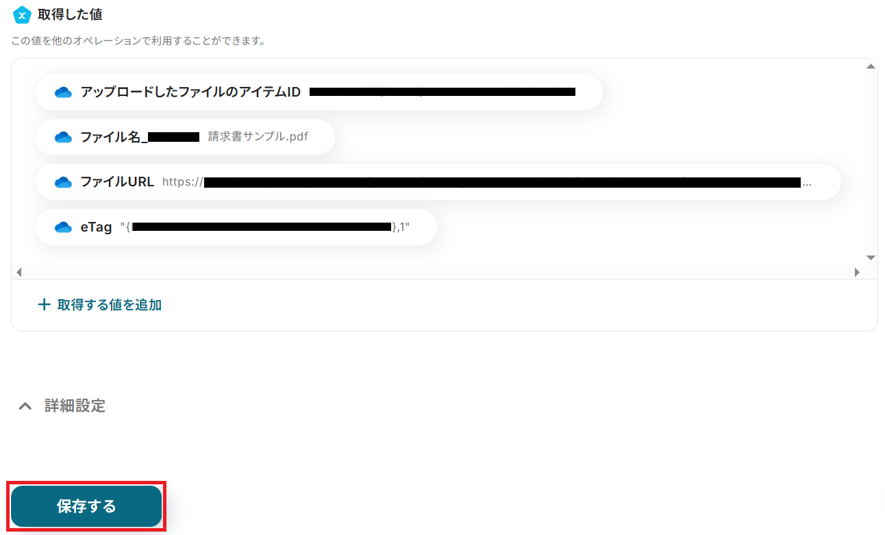 成功したら保存してください。ここで取得したアウトプットの値は次のステップで活用します。